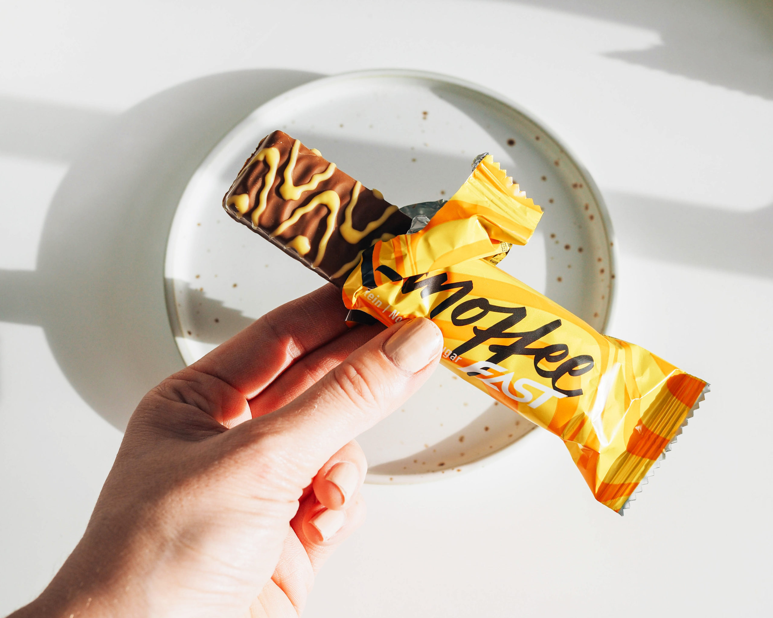Milk chocolate 20% (sweetener (maltitol, cocoa butter, milk powder, cocoa mass, emulsifier (soy lecithin), flavours), toffee 20% (polydextrose, milk protein, soy oil, stabiliser (xylitol), flavours, salt, emulsifier (soy lecithin), sweetener (sucralose)), milk protein, polydextrose, sweetener (erythritol, sucralose), humectant (glycerol), hydrolysated collagen, decoration 4,4% (sweetener (maltitol), cocoa butter, milk powder, emulsifier (soy lecithin), vanilla, color (lutein)), sunflower oil, emulsifier (soy lecithin), salt, flavours, color (beta carotene).